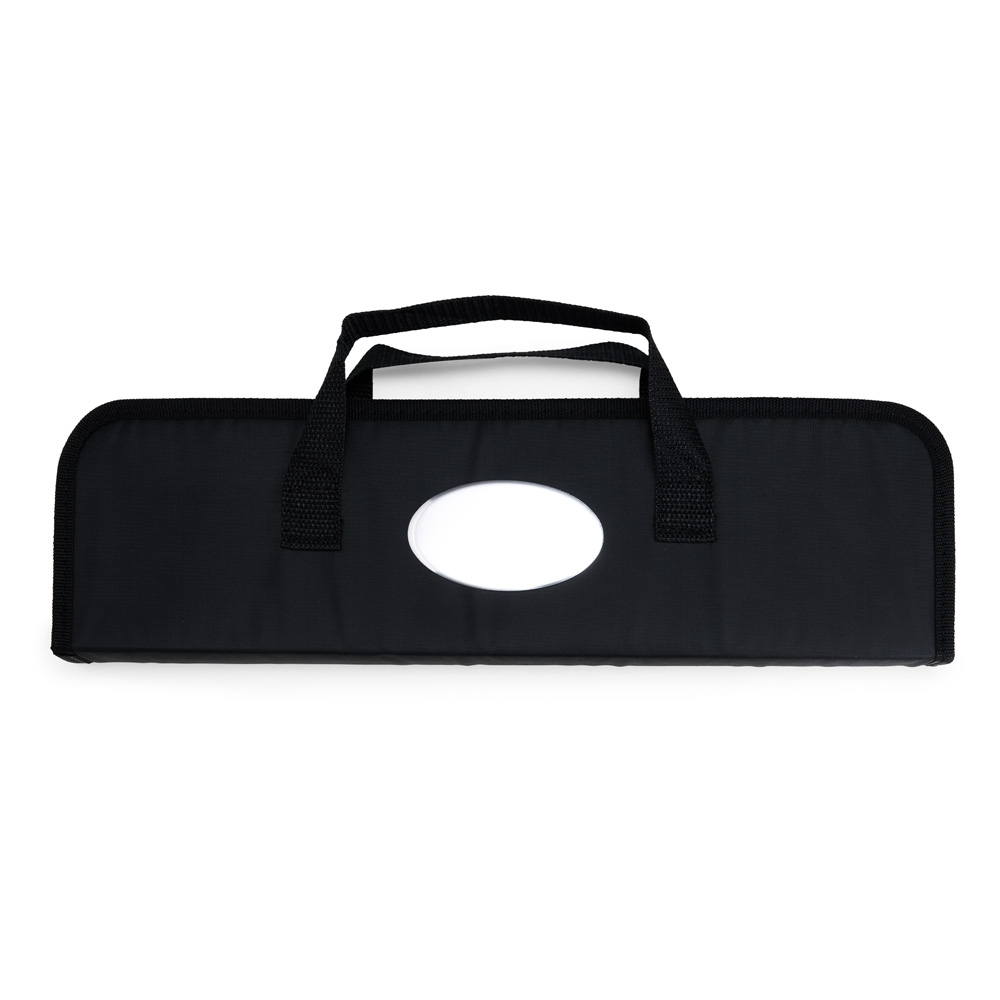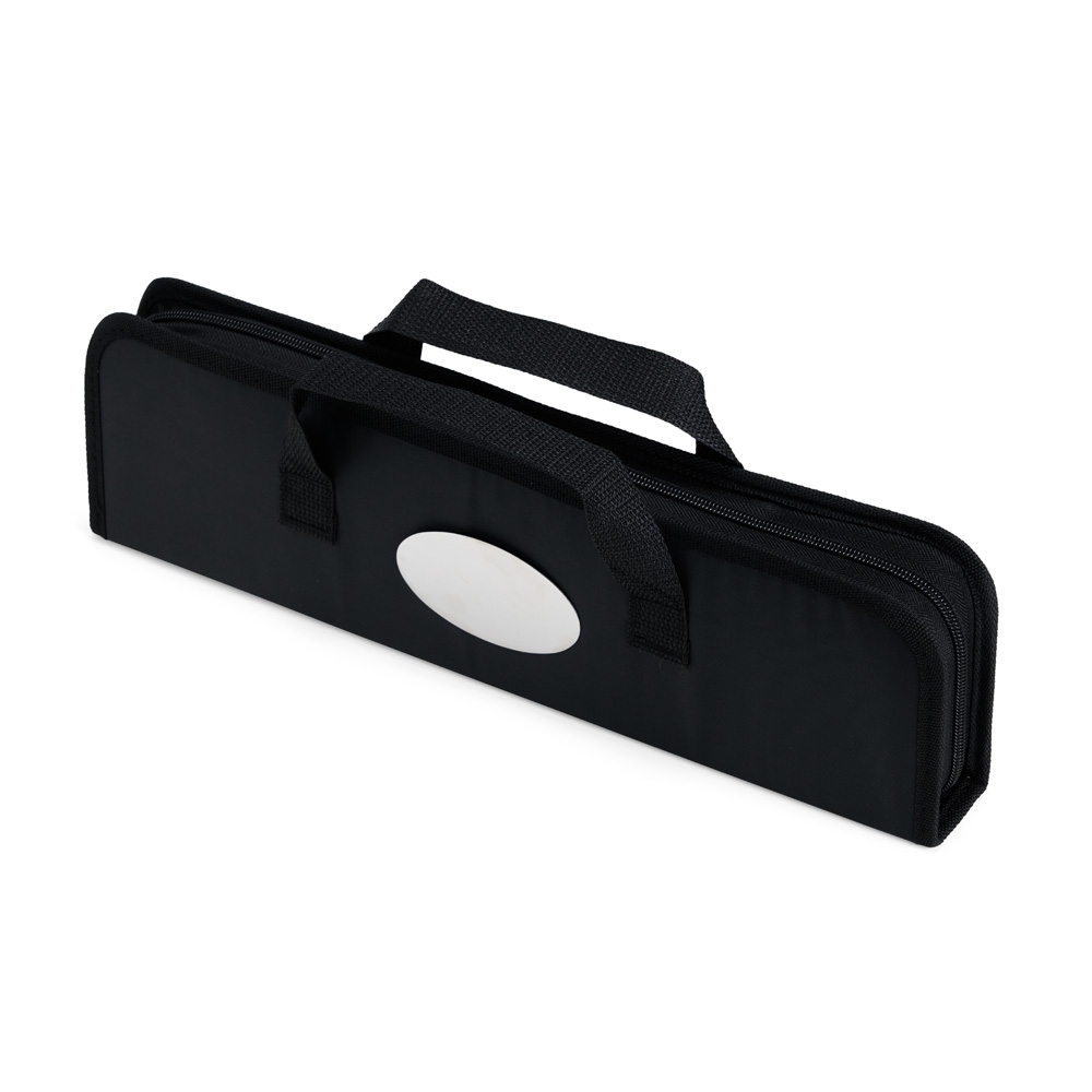 Brinde personalizado que acende conexões e celebra momentos com sabor e estilo Kit churrasco com 5 itens em aço inox indispensáveis: faca de 6,2", garfo, espátula, pincel com cerdas de silicone e pegador — tudo em estojo de nylon com alças fixas para transporte prático. Acompanha placa metálica personalizável com verso autoadesivo. Ideal para ações promocionais que valorizam confraternização, qualidade e presença de marca em ocasiões memoráveis.