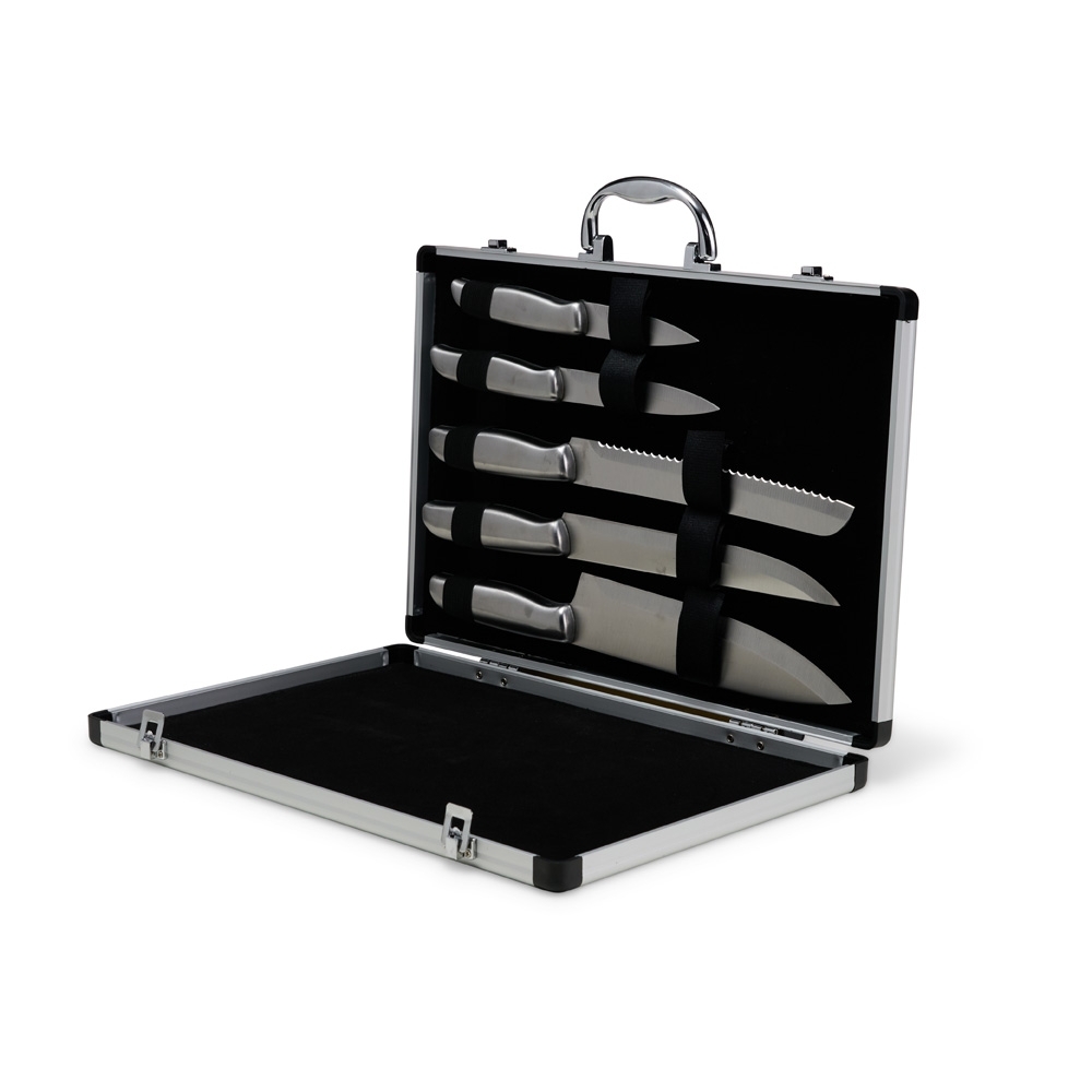 Brinde personalizado que transforma cada corte em uma experiência gourmet com sofisticação e segurança Kit com 5 facas em aço inoxidável de diferentes tamanhos, ideal para quem valoriza precisão e estilo na cozinha. Acompanha maleta de alumínio texturizado com interior em veludo e travas de segurança — com espaço para personalização que eleva o valor da sua marca. Um presente funcional e elegante para ações promocionais que deixam sabor e memória.