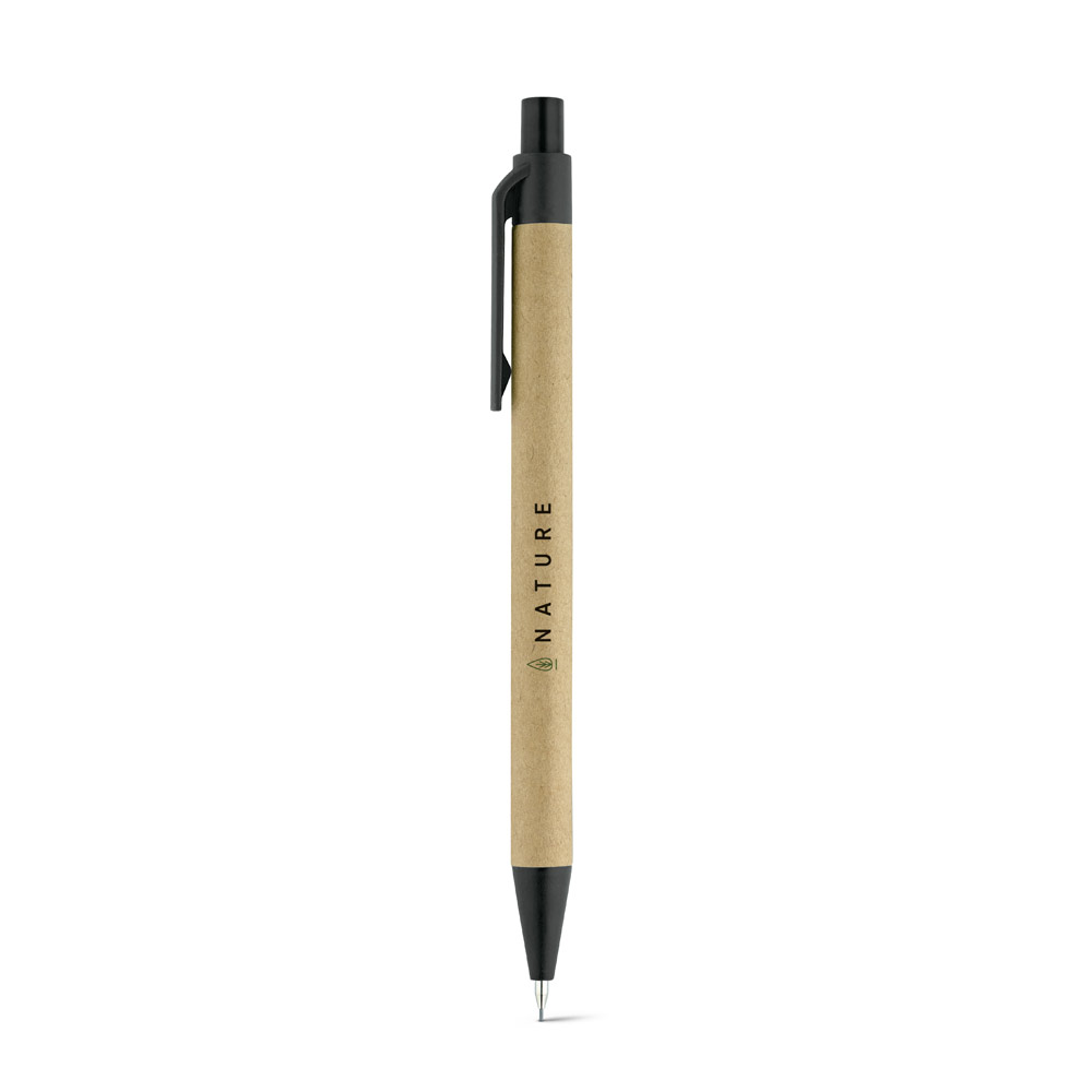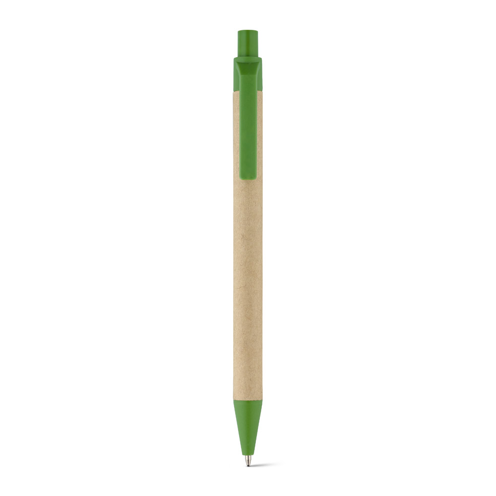 Brinde personalizado que combina consciência ambiental e praticidade Caneta de papelão com detalhes plásticos, carga esferográfica azul 1.0 mm e acionamento por clique. Uma opção sustentável e econômica para promover sua marca com propósito